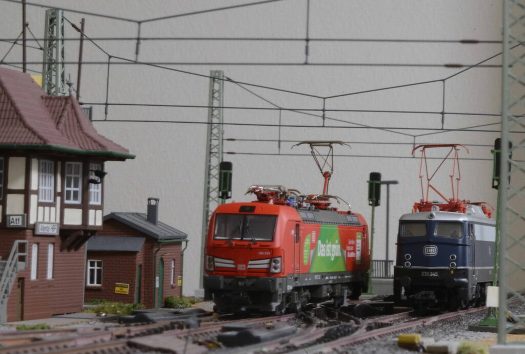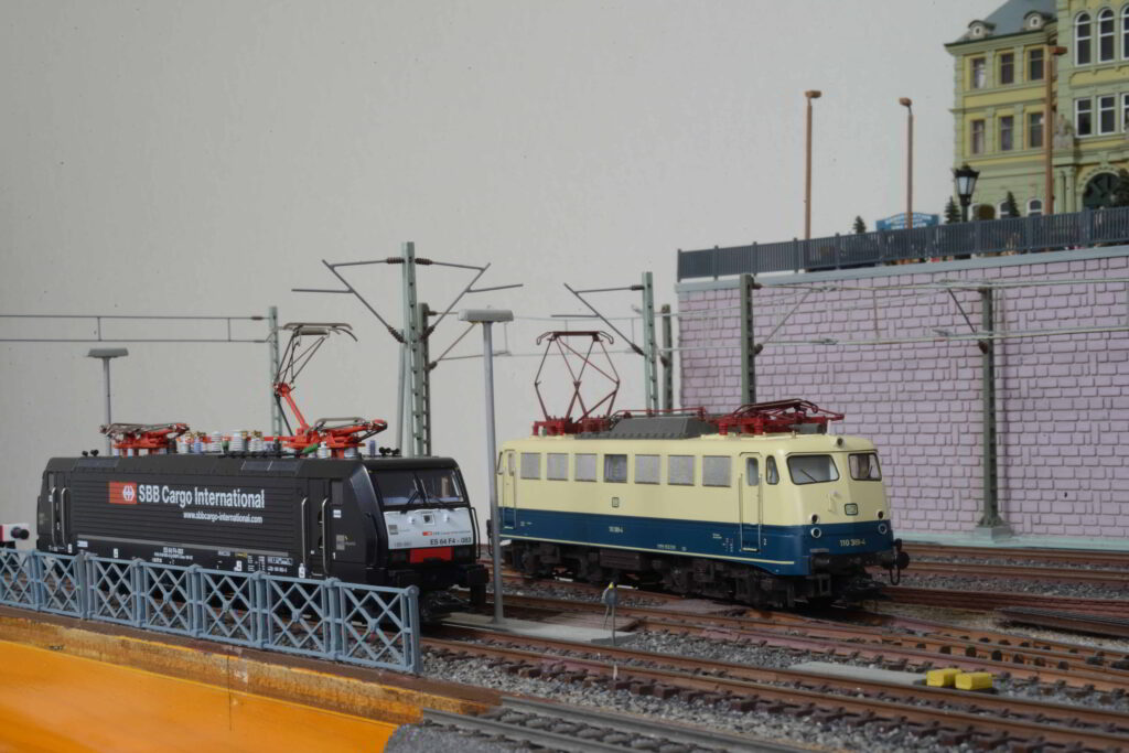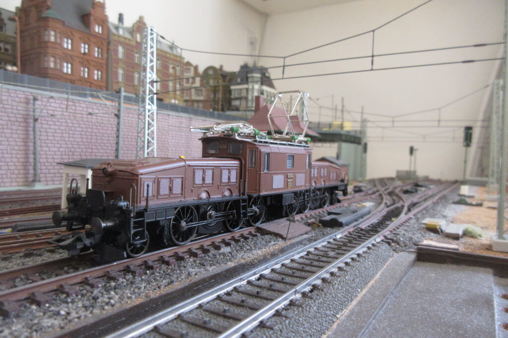 前回の信号機に続き今回は架線柱をはじめとした架線関連設備を紹介します.これらの設備も信号機同様実物の電化区間では必須の設備ですが,模型の機関車や電車を列車を運転するのに必須の設備ではありません.一方今回のような固定レイアウトではない可搬式のレイアウトセクションでは架線関連設備はは非常に破損しやすい設備ですので取り付け強度等,製作にあたっては色々考慮すべき点も多くあります.今回はその辺りについても述べてみたいと思います.それではまず最初にクロススパンの下を撮って駅に侵入するDouble Deckerのプッシュプル列車の動画と架線下に停車する電機の写真をご覧ください.