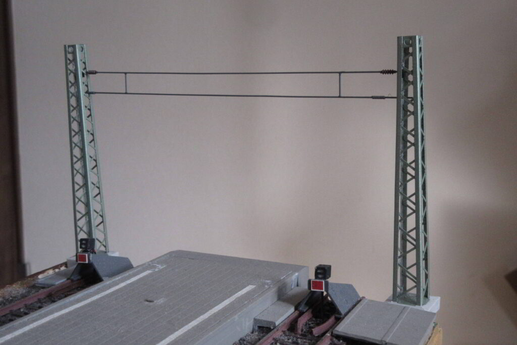なお架線柱の間隔は360㎜を基準とし,適宜増減しました.基準寸法を360㎜としたのはMärklin製の架線の最長長さが360㎜であるためその寸法を基準値としたためです.ちなみにSommerfeldt社の架線の最大長さは500㎜です.発着線と待機線の終端には架線終端のアンカーマストを設置し,マスト間に0.6㎜の真鍮線で製作したワイヤーを渡してあります.最初の設計段階ではアンカーマストを建てるスペースをあまり考慮していなかったため,待機線側はマストを建てるスペースが十分取れず,アンカーマストは架線柱を利用したものとなっています.実物の写真からもわかるようにタワーマストやアンカーマストの根本部はかなり太いため,設計時にはその大きさを考えてベースの大きさや周囲の建造物の配置を考える必要がありますが,今回のレイアウトではその検討が不足していたことが反省点です.