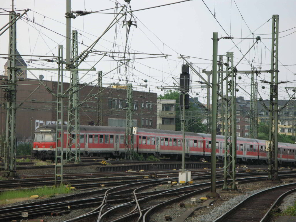 一方,ヤードや複々線区間では線路脇に建てられたタワーマスト間に渡したクロススパンで各線路の架線を支持しているいるところも多く,こちらはタワーマストが外側の線路の脇に建てられているのみであり,線路間には架線柱がなく,架線を支持する鉄製の横桁もないため見通しがよく,広々とした印象です.