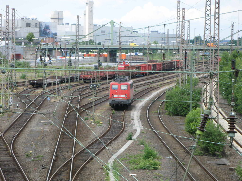 レイアウトに用いる架線柱のタイプはドイツ鉄道(DB)で多く用いられているLattice-type(格子構造)のタイプとしました.最近の高速新線等の架線柱はコンクリート支柱が用いられているようですが,Era III~EraIVの時代の車両が走るレイアウトにはやはり緑色に塗装されたLattice-typeの架線柱が似合います.日本では鉄道に用いられている碍子はほとんどが白色ですが,ドイツの鉄道では茶色の碍子が一般的なようです.また,機能はよくわかりませんが,架線柱の中には1本の架線柱に同方向に延びる2個のブラケットが装着されているタイプもあり,日本に比較してブラケットが大型で架線の上下寸法も大きいため線路が輻輳している駅構内では日本より架線設備が目立つ印象を受けます..