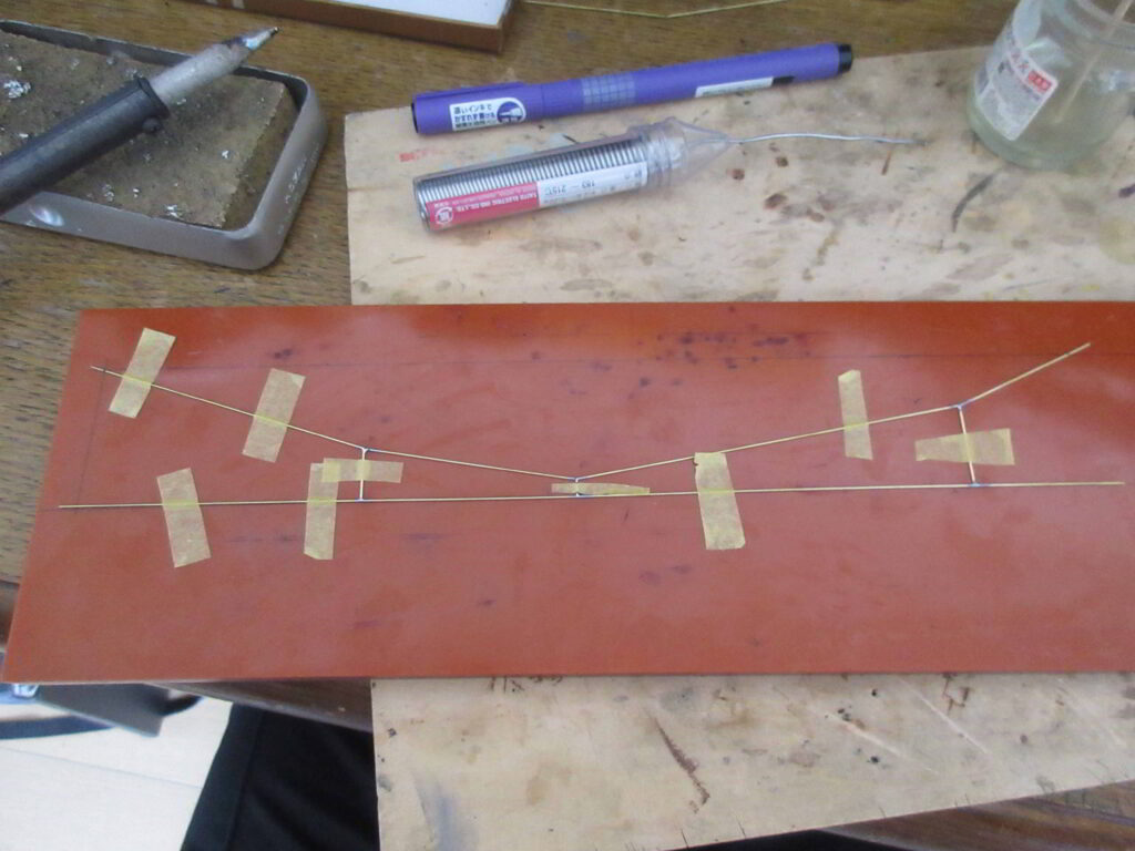 これは今回のような可搬式のレイアウトでは大きなメリットになります.反面,取り付け部が強固であるがゆえに何かが柱に強くぶつかると変形してしまい,形状がLattice-typeであることと相まって修復が大変(最悪の場合は交換)になりますので注意が必要で,特に今回のような床面に置くレイアウトでは足を引っ掛けないように注意が必要です.Sommerfeldt製のタワーマストの高さは140,160,200㎜の3種類ですが,私はその中で一番高さの低い140㎜のマストを使用しましたが実物のマストの高さはかなり高く,タワーマストを左右間隔約250㎜で配置する今回のレイアウトではタワーマスト間に渡すクロススパンの上下寸法が実物の印象より小さくなり実物の印象と少し異なってしまいます.しかし高さが高いと取り扱に支障をきたし,破損のリスクが高くなるように感じたためあえてこの高さの製品を採用しました.一方架線柱に取り付けるブラケットとTower mastに取り付けるクロススパンはパンタグラフと干渉しない形状として真鍮線により自作しました.欧州では架線集電の際の架線高さと車両のパンタグラフの高さはNEM規格(Normen Europäischer Modellbahnen(独語),英語ではStandards for European Model Railroads)で規定されており,架線高さはNEM201: Power wire Location でレール上面から60-73㎜(標準値69㎜),車両のパンタグラフの摺板高さはNEM202:Pantograph with Oveehead Wire Operation でレール面上から60-75㎜と規定されています.実際に手持ちの車両の摺板位置を測定すると73㎜前後でこの規格に適合しています.ちなみにNEM202にはパンタグラフの摺板の幅も国に応じた2種類が規定されておりNEM201にはカーブでの架線の許容変異量から架線柱の間隔を求める計算式が記載されています.このNEM規格と実際の車両の摺板高さの即位亭結果からこのレイアウトではブラケット,クロススパン共にパンタ摺板位置の高さはレール面上から78㎜を基準として製作することとしました.その製作過程の写真は下のとおりで,方眼紙上に作図したブラケット,クロススパンの形状をベーク板状に罫書き,真鍮線をマスキングテープで固定してはんだ付けしました.真鍮線はクロススパンは直径0.6㎜,ブラケットは直径0.7㎜の真鍮線を使用しました.クロススパンに使用する真鍮線は280㎜程度の長さが必要ですが,最近模型店で販売されている袋入りの真鍮線は長さが250㎜前後ですので使用できず,長尺の真鍮線を販売している模型店で入手しました.なお,架線柱に取り付けるブラケットの形状は製品の架線柱に開いているブラケット取り付け用の穴に合わせて決めてあります.組み立てには温調タイプのハンダゴテを使用しましたが,小手先温度が一定のため各部をはんだ付けする際にハンダの流れが一定となり快適な作業が可能でした.