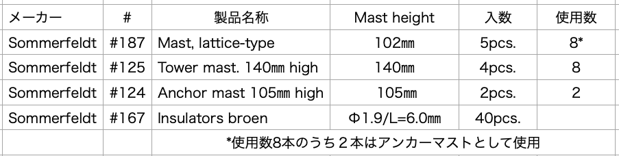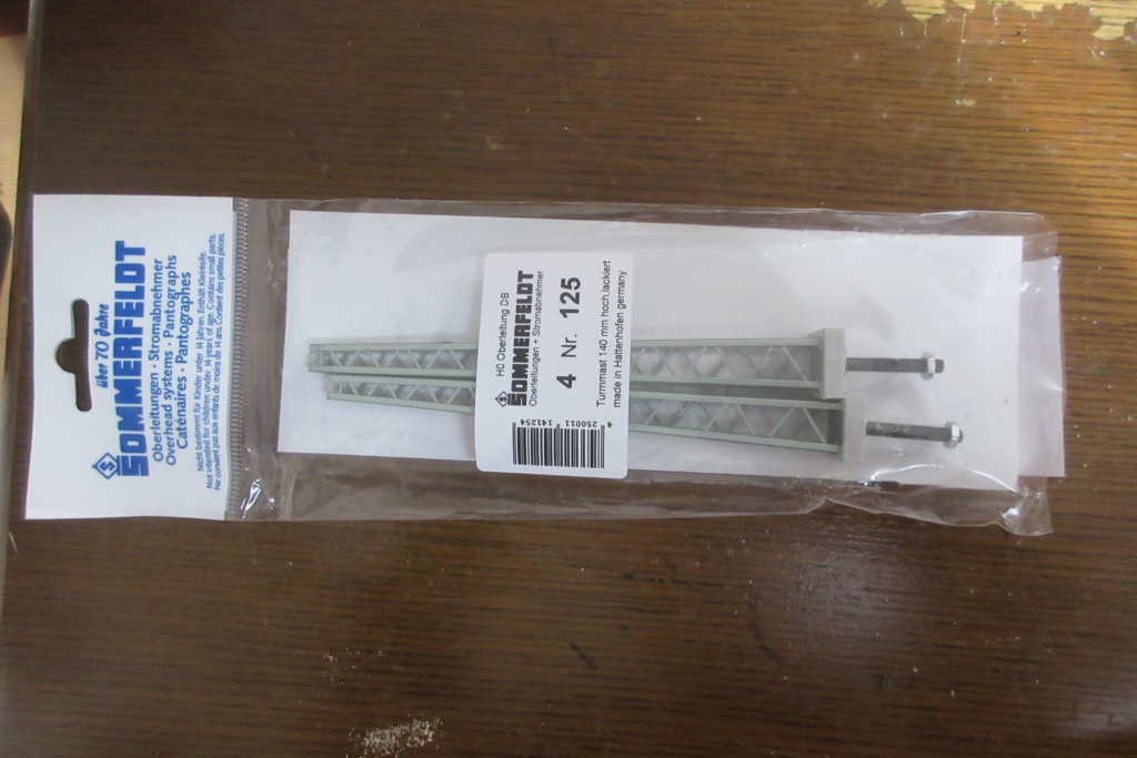 Lattice-typeの架線柱とTower mastはSommerfeldt,Märklin, Vollmer(Viessmann)社等から発売されていますが,仕様書に記載したように今回使用した架線柱とタワーマストはSommerfeldt社の製品です.Sommerfeldt社は鉄道模型の架線システムとパンタグラフを主に発売しているメーカーで架線柱は各国の種々のタイプを製品化しています.一方各社とも架線柱はパンタグラフによる架線集電に対応させているため,ブラケット付きの架線柱を使用してそのままベースに取りつけると架線を張らない場合はブラケットとパンタグラフが干渉してしまいます.Sommerfeldt製のブラケット付きの架線柱には嵩上げ用の部材が入っていますがそれを用いると実感を損ねてしまいます.それでもSommerfeldt製の架線柱にはブラケットがない架線柱がありますのでブラケット部分を自作すれば架線を張らなくてもパンタグラフと干渉しない架線柱が製作可能です.またタワーマストも色々な高さの製品が用意されており,その中から製作するレイアウトに適した製品を選択することが可能です.一方この架線柱は他のメーカーの架線柱と異なり架線柱に下部に固定用のM3-M4のボルトがついており,ベースに穴を開けて裏からナットで固定することにより架線柱やタワーマストをベースに強固に取り付けることが可能です.また本体は金属であり,多少何かをぶつけても樹脂製の架線柱のように折れることはありません.