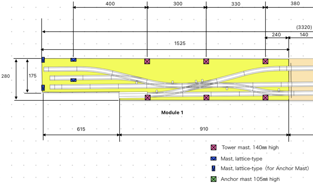 以上がこのレイアウトセクションの架線システムの概要です.これで模型の運転には必須ではないもののレイアウトの情景としては必要である信号機と架線システムの紹介が終わりましたので次回以降は情景のさらに詳細な部分について紹介していきたいと思います.