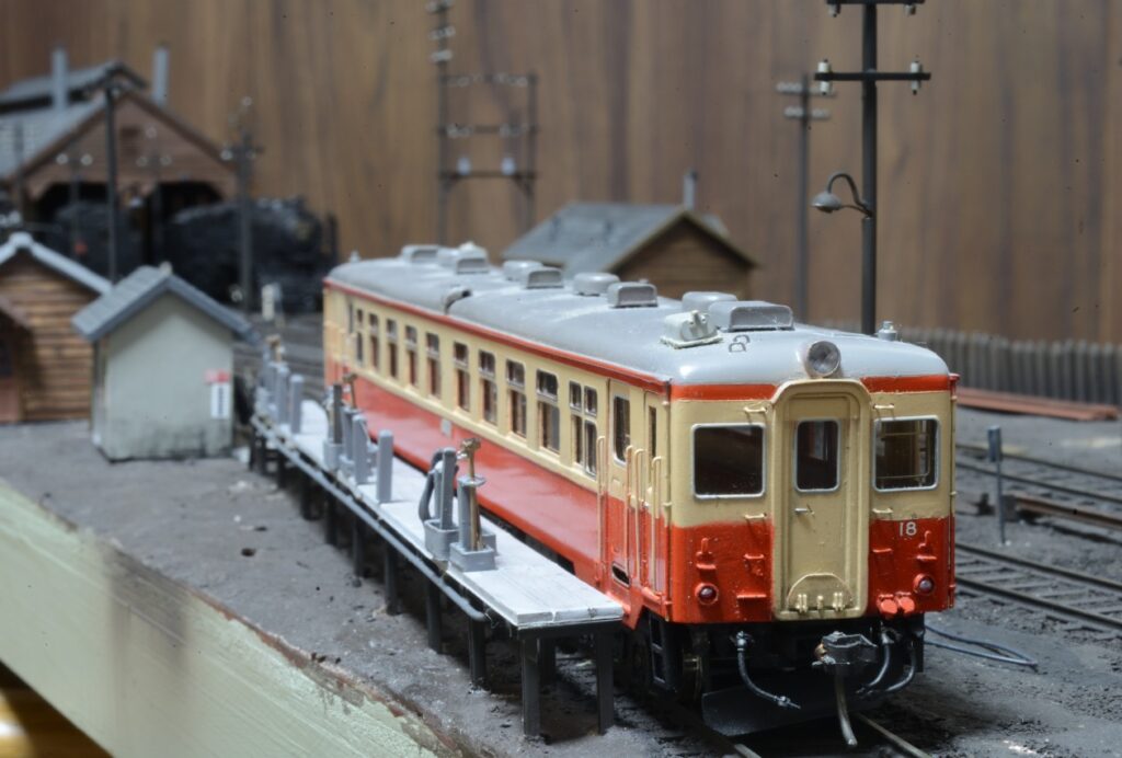 1960年台にはまだ三鷹電車区のような”都会の電車区”にも車両の自動洗浄設備はなく,洗浄台の上では多くの人々が手作業で車両の洗浄を行なっており,人道こ線橋上からはその作業を間近に見ることができました.この時のイメージを元に洗浄台上に各種のアクセサリを配しています.
