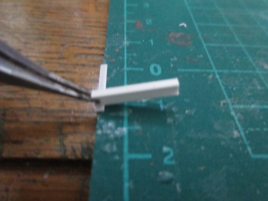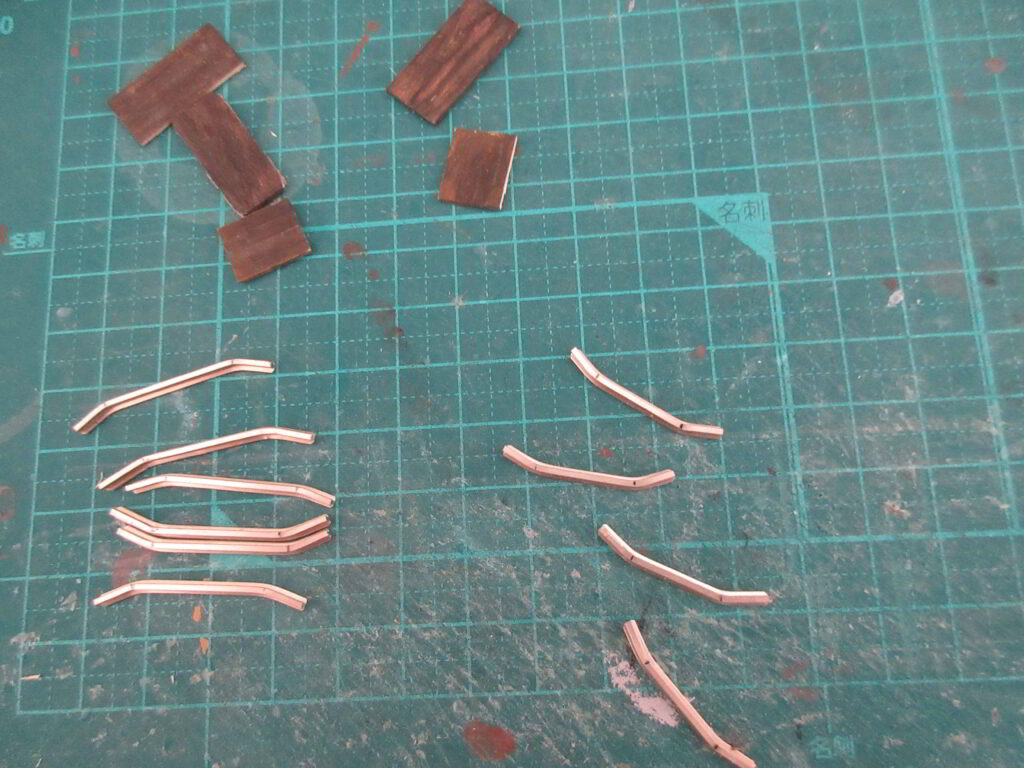 製作したアクセサリは左よりホース掛け,水道蛇口と流し,モップとモップ置き.雑巾干しです.一部のホース掛けにはエコーモデル製のバケツをぶら下げてあります.水道蛇口はエコーモデル製ーのパーツ,ホースはAWG#30ケーブル,その他はEvergreen社製のプラ素材やケント紙で製作しました.また洗浄台の下側には真鍮線で製作した水道管を取り付けてあります.ハシゴはEvergreen社製のIビームとプラバンで作成しました.
