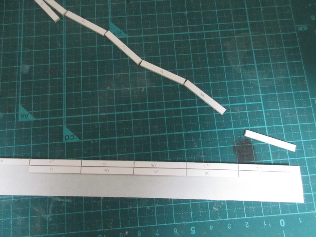 通路となる部分は1㎜厚のイラストボードで作成し,1㎜厚のイラストボードを所定寸法(長手方向は脚部の間隔)に切断後、切断前と同じ配列でラベル氏の上に並べ, あらかじめレイアウトに取り付けた脚部に接着しました. 組み立て前に脚部はダークグレー、通路はライトグレーに塗装してあります.