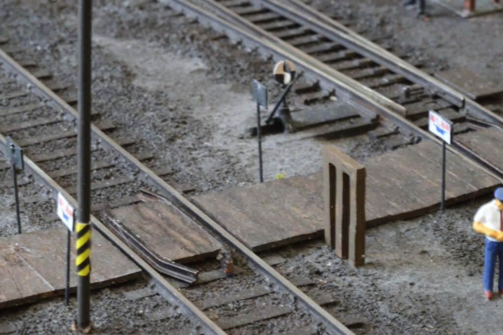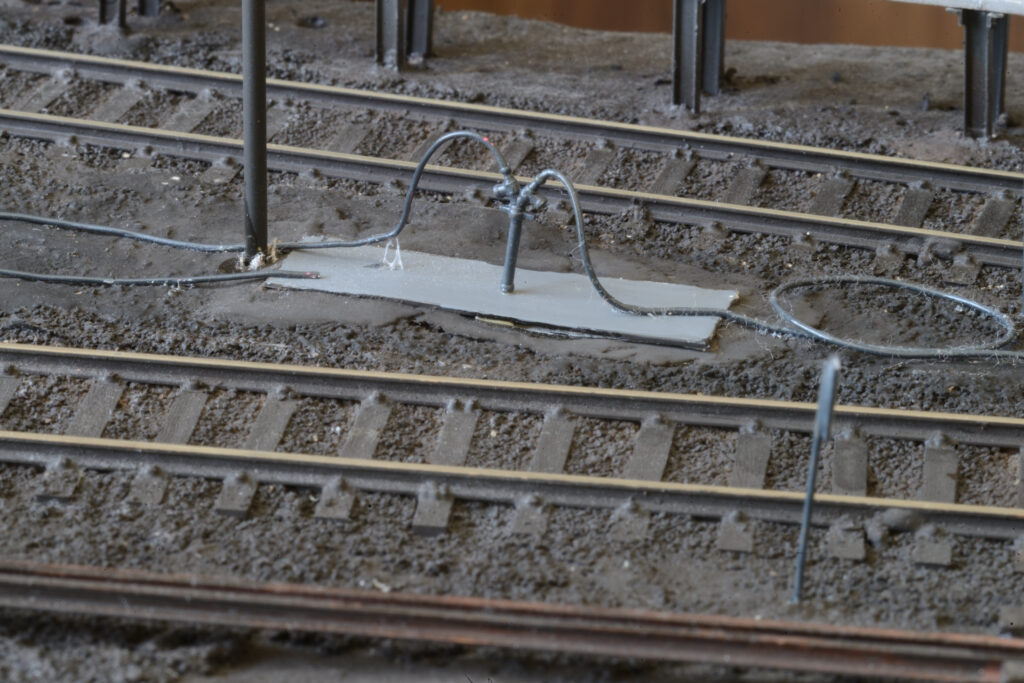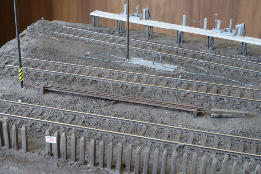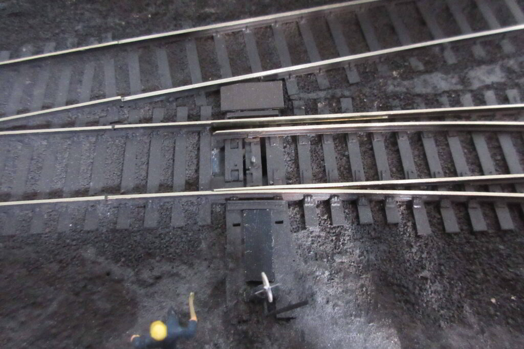 実際の分岐器は転轍機とポイントレールの間に切替用の動作機構が存在します.しかし模型の場合はその機構はダミーとなりますので省略し,網目板で製作した蓋を取り付けてあります.このような実例があるかどうかは不明ですが積雪地にはありそうではないかと考えてこの形としました..転轍機の反対側もポイントレールの可動部がレールの外側に突出しておりバラスト散布ができないのでその部分にはSTウッドで作成した蓋状のものを取り付けました.