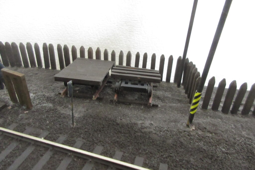 物資運搬用のトロッコは2台製作し短く切断したレールの上に配置してあります.車輪はNゲージ用の車輪を用いて両端の軸を切断した後車軸を中央で切断しパイプを嵌め込んで期間を広げました.本体は1台を台枠のみとし,もう1台は台枠状に木製の床があるタイプとしました.台枠はEvergreen社製のプラ素材,床はSTウッドを用いて製作しています.台枠が露出しているトロッコの台枠上には古枕木を載せてあります.