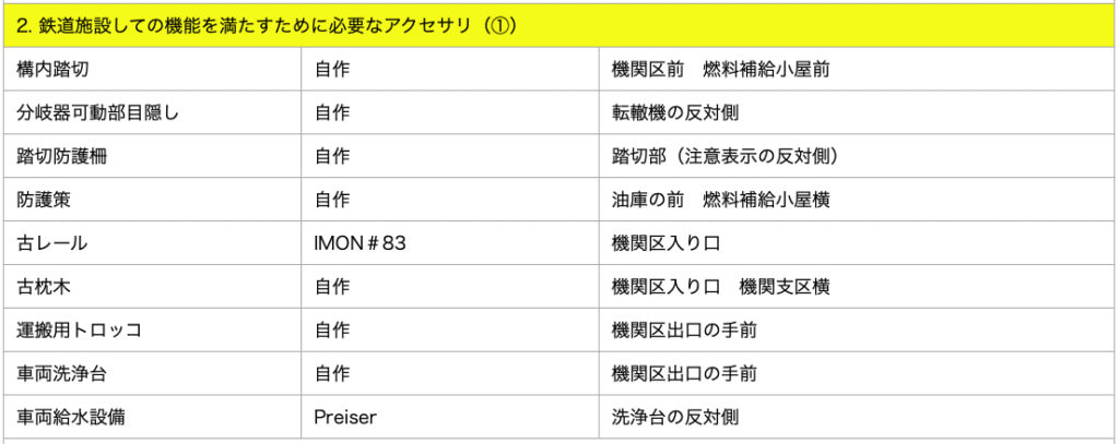 蒸気機関車が活躍していた時代の機関区(15)でアクセサリの一部を紹介した後,諸般の事情でこのレイアウトに関する紹介を長らく中断してしまいましたが,引き続き(16)としてレイアウト上のアクセサリの紹介を続けさせていただきます.今回は下の表に示す機関区設備のアクセサリを紹介したいと思います.