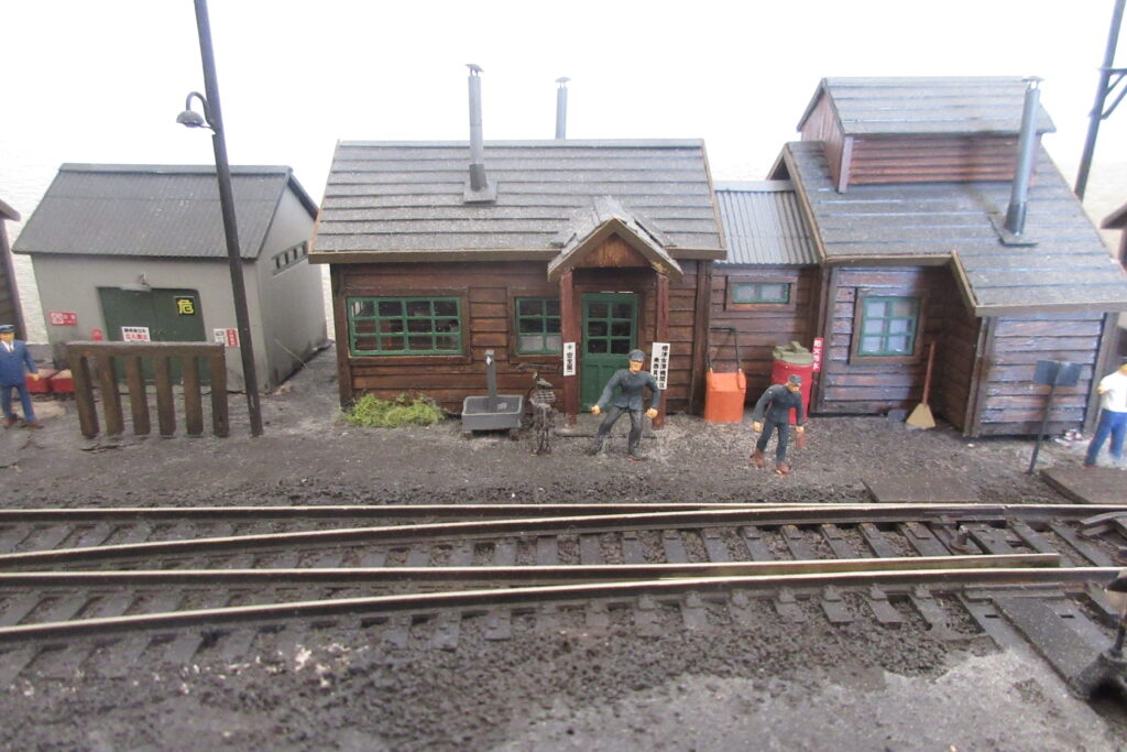 レイアウトの設計にあたり特に気をつけたのは建物の大きさです.幸い日本家屋は”1間”という建物の統一基準がありますので横方向の寸法どりは比較的容易です.問題は高さ方向で基準はあまり明確ではありません.こちらはかつてTMS誌に掲載された荒崎良良徳氏執筆の”日本の木造家屋”という記事を参考に写真も参考にしながら寸法を決めました.ところが建物が出来上がって配置してみると何となく建物が小さく感じます.国鉄の蒸機の全高は4m弱ですので土台の低い機関区の建物は結構小さく見えるのですが,それでも想定より少し小さく,少し大きめに作った方が良かったのかと思いました.ただよく見るとどうも建物が小さく見える原因は線路の軌間の広さのような気がします.特に車両がいない詰所前でフィギュアが配置されているところを見るとその感が大きいように感じます.