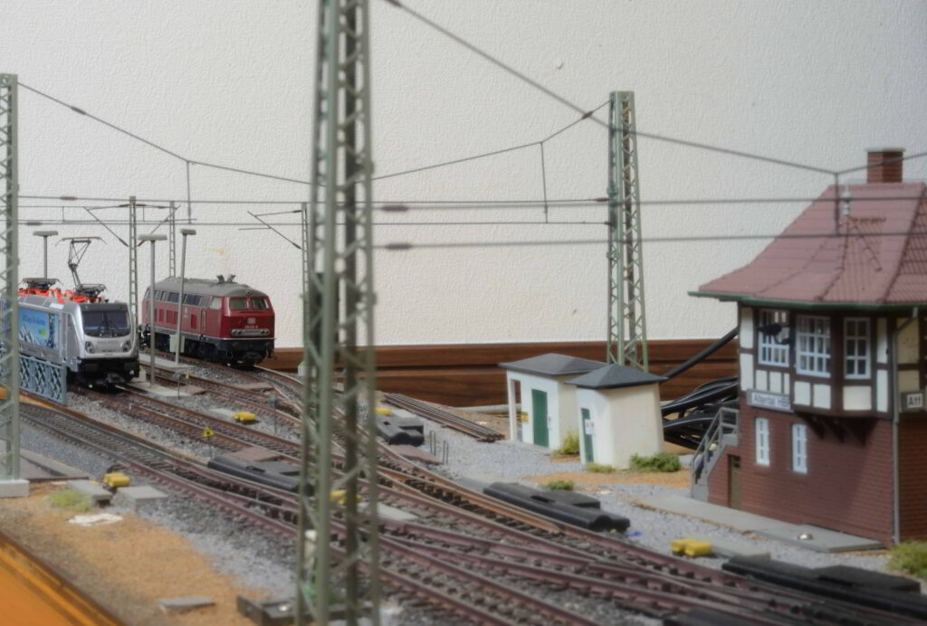280㎜幅ですとプラットホームの幅を確保した上で敷設できる線路は3本が限界ですのでそれを前提にして考えると次に決定すべきことは通過線を2本にするか3本にするかですが,私は通過線を1本としました.理由は停車できる列車の長さが発着線の方が長くできること,比較的大きな規模の駅ですので駅でのすれ違いや列車交換はあまり気にしなくて良いと考えたためです.頭端式のホームでは当然到着した客車列車の折り返しをどうするかが問題となりますが最近では機関車牽引の長距離列車でもプッシュプル方式の列車が増えていること,プッシュプル列車ではなくても到着列車はホームに対向する位置にある機関車の待機線で待機する機関車と機関車交換が可能になることも通過線は1本で良いと判断した理由です.私は実際に見たことはありませんが欧州の頭端式の駅では頭端側で機関車を解放したのち反対側に別の機関車を連結し,列車発車後の開放された機関車がその後を追うように発車し待機場所まで戻るという例があるようです.そこでプッシュプル方式ではない機関車牽引列車の折り返しはこのような手順を想定し,発着線には開放ランプを設置してすることとしました.分岐器は分岐側半径902.4㎜の大型の分岐器とダブルスリップスイッチを使用し,線路間隔は並行する線路が57㎜,島式ホームを挟む部分が102㎜としています.この102㎜という寸法は使用するKibri 39565(Platform hall Bonn)に付属しているプラットホームの幅に合わせて決定しました.発着線の出口はダブルスリップスイッチを配して発着線で客車を解放した機関車はこのダブルスリップスイッチを通って待機線に向かう配線としました.ダブルスリップスイッチは欧州の駅では多用されており,スペース上も有利であるため欧州のレイアウトプランでは多用されています.今回のプランでは小規模の駅となるためダブルスリップスイッチは1個しか使用していませんが欧州の比較的大きな駅の雰囲気を出すには不可欠?のアイテムのような気がします.また下の写真にもありますが,日本ではほとんど見かけることのないクロッシングもよく使用されているのを見かけます.なお,2線式のダブルスリップスイッチはフログの極性の切り替えが複雑になりますが3線式の場合は何もする必要はありません.