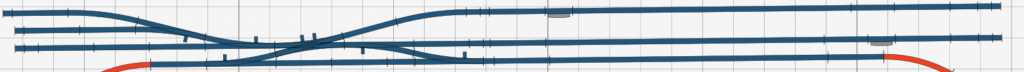 言葉ではわかりにくいため,実際の線路配置を示し,この線路配置とした理由を説明します.下の図の青い部分が今回製作したレイアウトセクションで,赤部分はセクションに繋がる線路(セクション外)になります.非常に細長いセクションのため,モバイル端末では図が小さくなり非常にわかりにくいと思いますがご容赦ください.