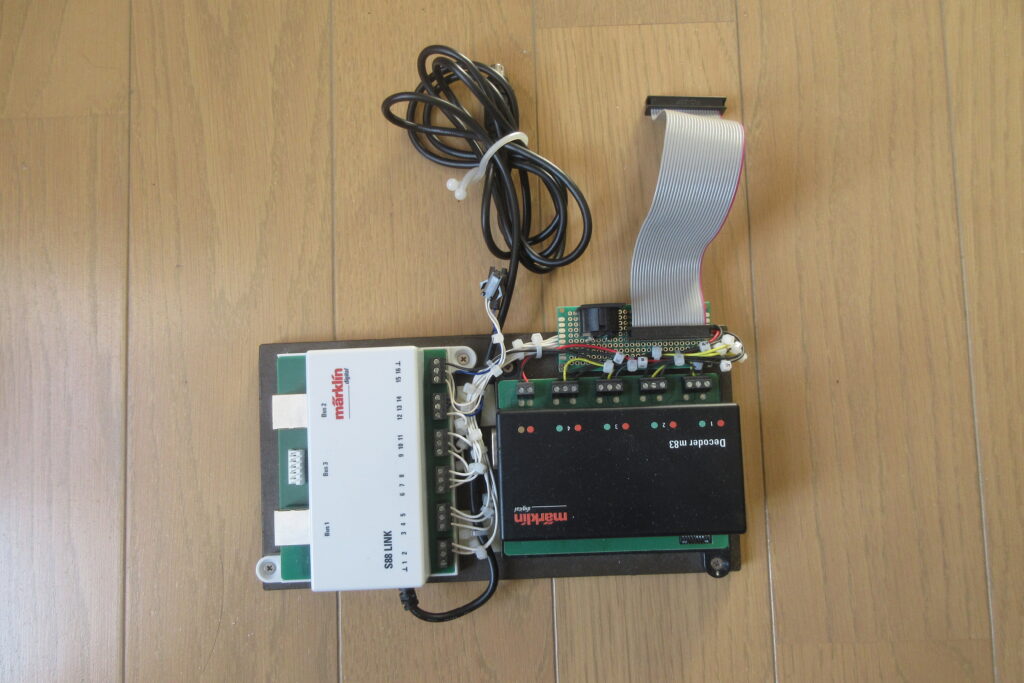 上図の下側にあるNHコネクタで繋がれた4本の線路(#24172)はC trackを加工してs88コンタクトを設けた線路です.この線路はこのセクションに接続するCトラック上にs88コンタクトを配置する目的で製作したもので例えば駅を出発した時点で赤現示となった出発信号機をこのs88コンタクトを利用して青現示に切り替える等に使用することを想定しています.また,上図のLink s88は下の写真に示すようにm83デコーダーと一体のユニットとして製作しています.
