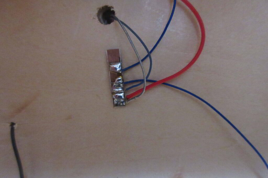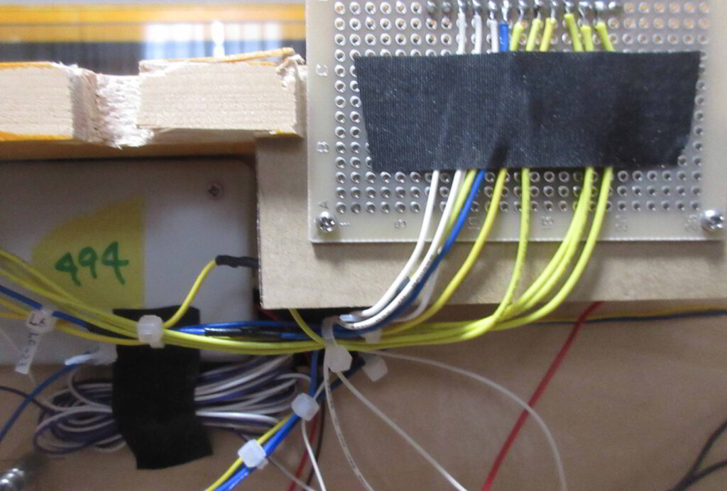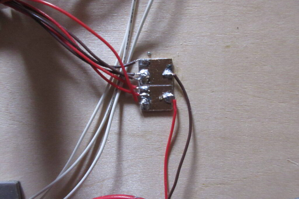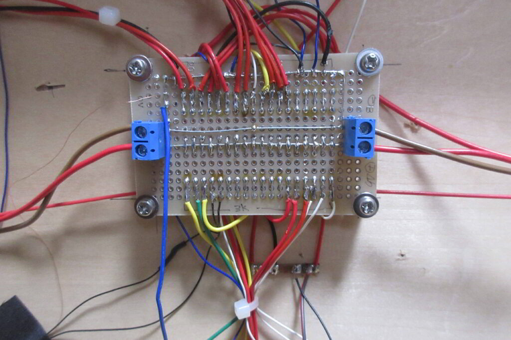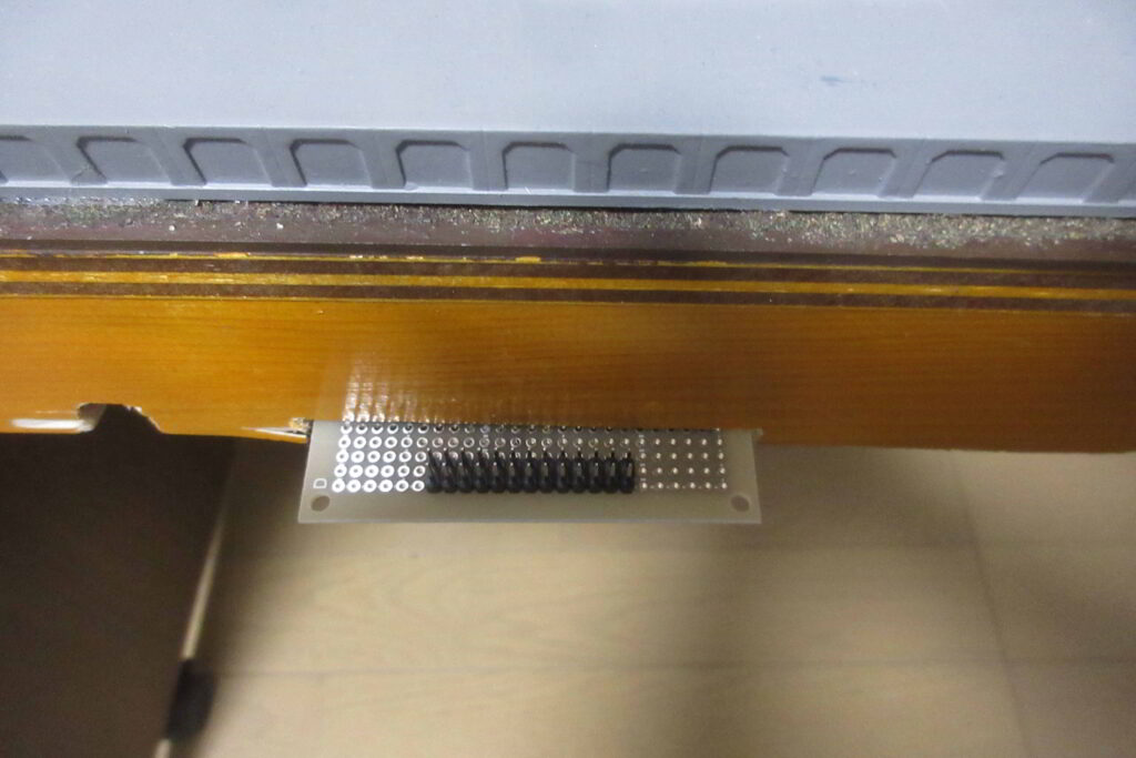 各照明塔の近傍にはパターンをPカッターで2分割した後小さく切断したベアボードを取り付けてこの基板でPower Distribution Boardからのリード線と照明等からのリード線を中継しています.照明灯が破損した場合はこの部分のハンダを外して照明灯を取り外して修理,交換を行います.この中継基盤は制限抵抗を介さないcathord側の配線の中継にも使用しています.