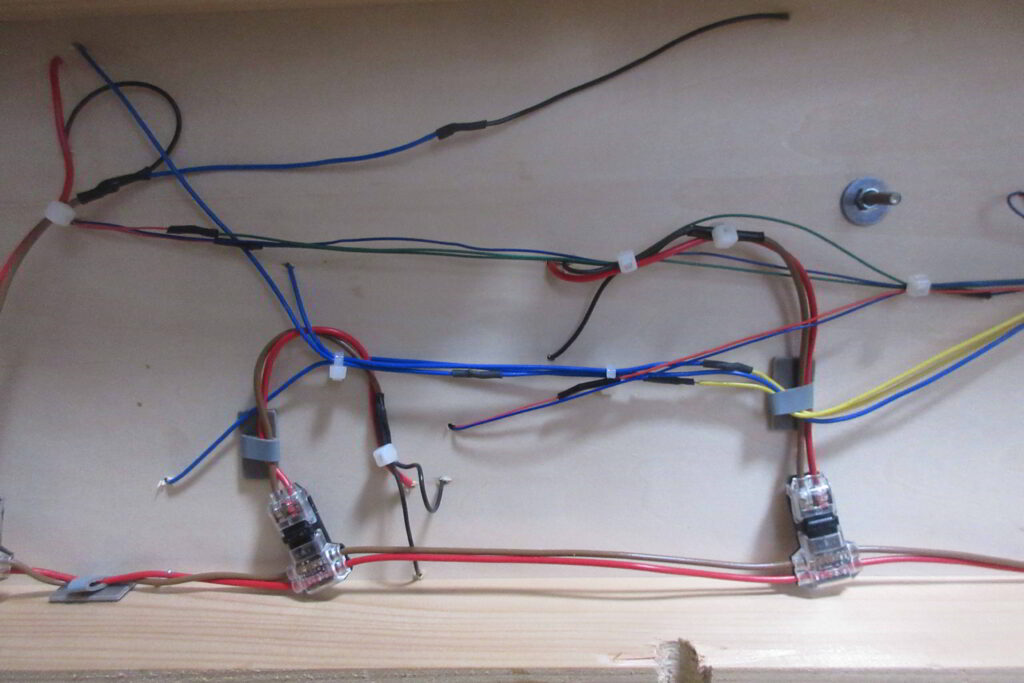 以上で電気関係の回路の詳細説明を終わります.このような回路図は確実に残しておくことが後々のレイアウトのメンテナンスには不可欠ですが,今まで製作したレイアウトセクションはモジュールに分割しないため図面作成は作業と同時に行なっていました.しかし今回のレイアウトセクションは複数モジュールを接続するため,特にモジュールの接続やデコーダーをとのモジュールに設置するか等については事前に検討が必要であったため事前に仕様書に記載し,問題ないかを確認するという対応を行いました.以下,実際の配線の状態を写真を主体に説明します.
