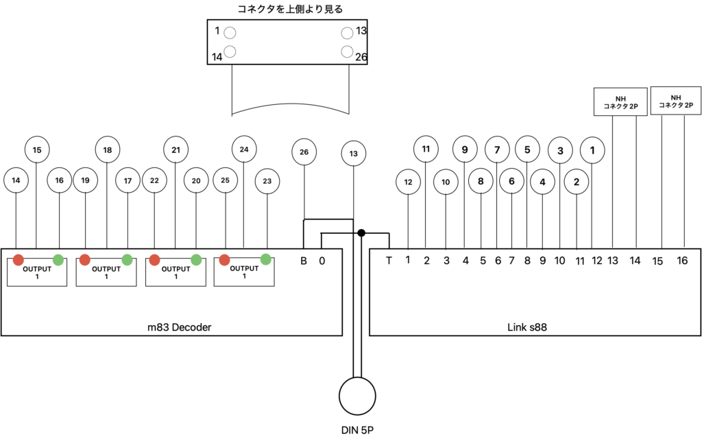 このようなユニットを製作した意図は,このユニットを他のレイアウトにも使用することを想定したためです.即ち,今回製作したレイアウトセクション以外のレイアウトにこのユニットを接続してこのユニットのLink S88とm83デコーダーが登録してあるCS 3を接続すればこのユニットのm83デコーダーのアウトプットのアドレスとLink s88のs88コンタクトのコンタクト番号でこのレイアウト以外のレイアウトがこのユニットで制御可能になります.なお,今回のレイアウトセクションでは分岐器制御用のm83デコーダーはレイアウト側に取り付けていますのでこのユニットに搭載されているm83デコーダーは使用していません.このユニットに回路図を下に示します.ユニットにはDINコネクタを設けてありこのユニットのデコーダーに供給する走行電流はフラットケーブルまたはDINコネクタから供給します.ちなみにフラットケーブルに使用されている線材はAWG28で許容電流は2.4Aです.