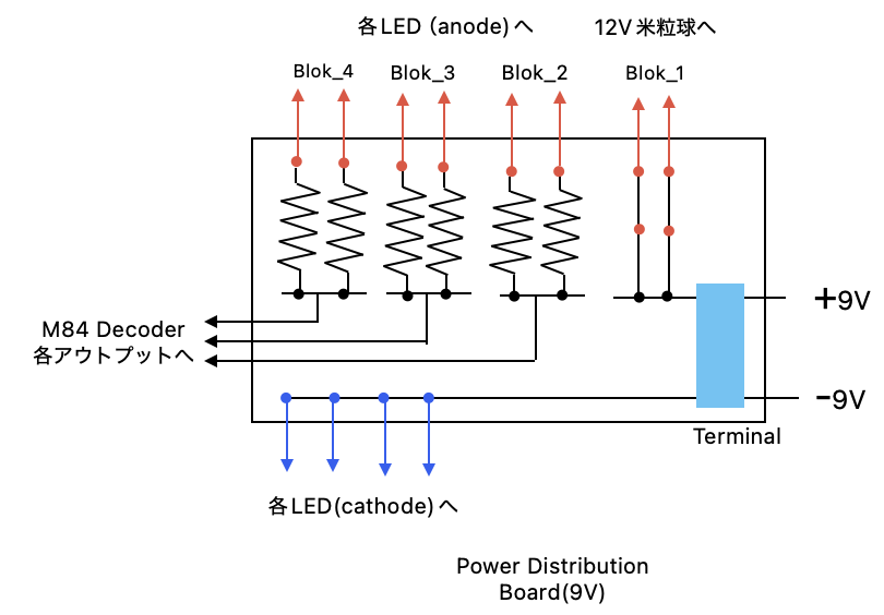上の回路図はModule1に取り付けた9V用の基盤の回路ですが,Module2に取り付けた9V,15V基盤にはブロック分けはなくm84 decoderのアウトプットを一括してon/offします.