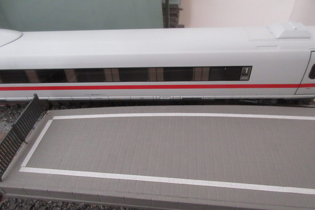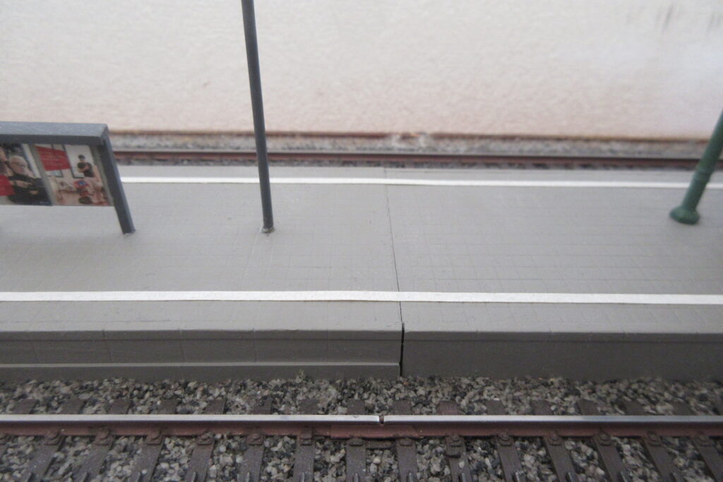 ホームが完成したらホームをベースに取り付けます.取り付けの際高さ調整に使用したスペーサーは仕様書の図を参照してください.この取り付けの際のホーム側壁と線路中心の間隔は20㎜としました.これはNEM規格 “#102 : Area Clearances on Straight Track”に規定されている車体下部(高さ10㎜まで)での最小値です.ただ条件として車両側が “#M301: Perimeters of Vehicles”に適合することが条件となっています,確認はしていませんがMärklin製の車両はおそらくこの規定に適合していると判断し,この値を採用しました.また,島式ホームは一部曲線(R=902)にかかっているところがあります.直線からカーブにかかるところの車両限界もNEM ” #103 : Clearance Perimeter in track curves” で規定されていますが,この規格によればカーブの入り口でレール中心とプラットホームの間隔は直線部より5㎜広げることが必要です.また線路中心からの間隔を広げ始める開始地点も規定されていますが,こちらはその規定どおりではなく規定を参考に実際に車両を通過させて確認しながら形状を決定しました.確認には全長約300㎜のICE3を使用しましたが,最近のMärklin製品は,PIKO社と協業で開発したスケールどおりの全長(305㎜)を持つ車両もあるようですので注意が必要です.ちなみにICE3はカタログには最小通過カーブがR2(半径437.5㎜)という記載があり,PIKO社と協業した全長305㎜の製品は周囲とのクリアランスを無視すればR1(半径360㎜)の曲線が通過可能という記載があります.日本型の模型の場合,いわゆる国鉄型に準ずる20m級車両の最小通過半径は450-550㎜,細密モデルでは半径600-750㎜以上の車両が多いようで,欧州製の車両は日本型の車両に比較して非常に小さいカーブが通過可能です.ただ,実際に今回のようなレイアウトを製作してみるとわかりますがこの最小通過可能半径について,日本型の車両のように車両に小径カーブを通過させるためにはディテーリングに制約が発生することに加え,小径カーブを通過する車両は実感的でないので最小通過可能半径は大きくても構わないという考え方はレイアウトでの運転の観点から言うと大きな問題があると感じます.