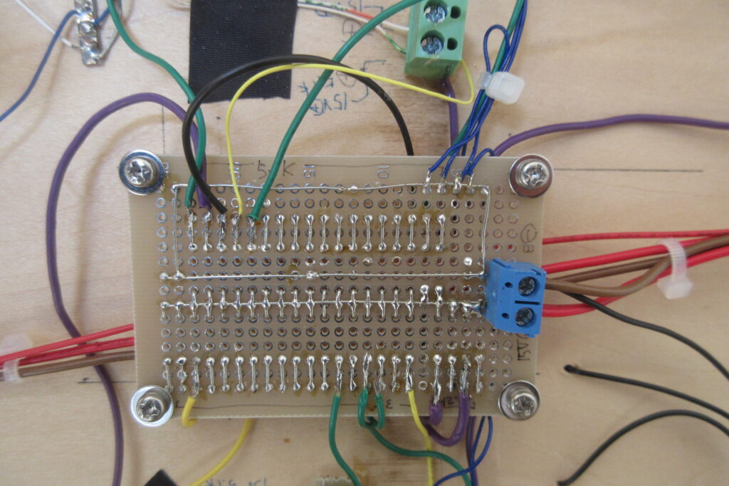 上の回路図に示すように1個のホーム上屋から出るリード線は上屋1個あたり4本ですが,このリード線はAWG#32の電線を使用して片側2本ずつホームの支柱に沿わせてベース下に導いています.リード線はホーム支柱にテグスで縛って支柱に固定した後支柱と同色に塗装しました.ただこの部分はポリウレタン銅線を使用した方がより目立たなくできたのではと思います.私の世代に理科の実験等で使用した「エナメル線」は接続部のエナメルを機械的に除去する必要があったため配線には非常に手間がかかりましたが現在市場に広く出回っているポリウレタン銅線はその必要がなく取り扱いが簡単で,外観の目立つ部分にはもっとこの銅線を利用しても良かったのではないかと思っています.また,上の写真の一部写っているように上屋からの配線はねじ止め式のターミナルで中継していますが,これは製作中にホーム上屋を頻繁に取り外すことを想定したためです.ただ本来このようなターミナルは細径のリード繊には使用しません(仕様外です)ので.別の方法にした方がよかったかもわかりません.なお,LEDは中央部でパターンを切断した厚さ1㎜のベアボードの小片に取り付けてリード線はそのベアボードにハンダ付けしています.