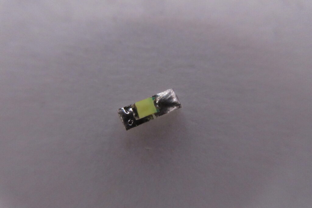 上図からもわかるように上屋のドーム上の屋根部分に黄色のLEDを6個,支柱を結ぶ梁の部分に3個(両側で6個)のLEDを取り付けています.これらのLEDは上屋部分に制限抵抗を取り付けるスペースがないこと,電源を供給するリード線の本数を極力少なくするため,ドーム部のLEDは黄色LEDを6個直列に,梁部のLEDを3個直列に接続してあります.一方今回使用したLEDは黄色LEDの点灯に必要な順方向電圧が約2.2V,電球色のLEDの順方向電圧が3.0V(いずれも最大値)であるため,9Vの電源では電圧が不足します.このためこの部分の電源のみ電圧を15Vとしています.制限抵抗は黄色LED回路に3.1kΩ,電球色LED回路に5.1kΩの抵抗を使用し電源供給基板に実装しています.なお,照明に使用する全ての電源の電圧を15Vとしなかった理由は照明の一部に12Vの米粒球を使用しているためです.