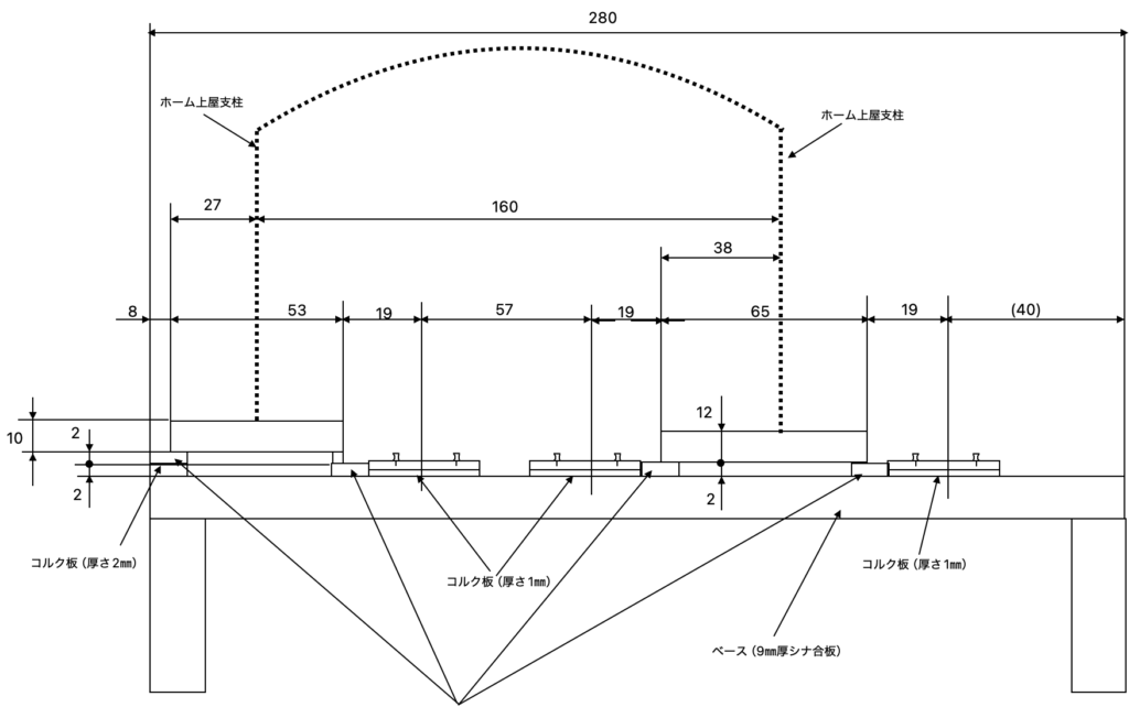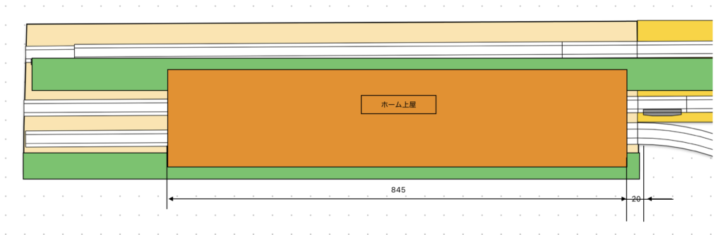 プラットホーム,ホーム上屋のベース,線路の位置関係を下図に示す