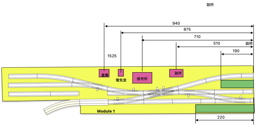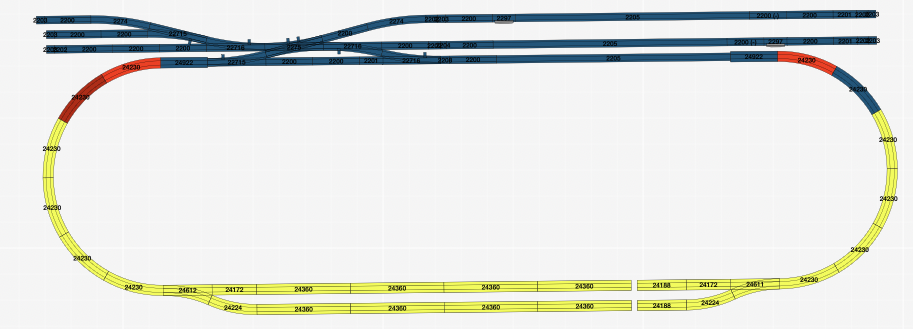 確かに小径カーブを通過する車両は実感的ではありませんが,それは「見えるところ」での話であって「見えないところ(注目しないところ)」では車両がカーブを通過できさえすればいくら実感的でなかろうと全く問題ありません.今回のレイアウトは全長が3400㎜近くありますが,下図のようにその全長の中にセクションの通過線を結ぶ半径437.5㎜(R2)のOVAL形状のの周回線をほぼ収めています.全長3400㎜はいわゆる「6畳間」のほぼ長辺の長さですが駅セクションの長さをそのままに曲線半径を大きくするととてもこの幅にはおさまりません.また小径カーブを用いることにより短編方向にも余裕が生まれますので曲線の中間に直線区間を設けてOVALの中に運転位置を設けることもOVALを片側に寄せてOVALの外に運転位置を設けることも可能です.このようにレイアウト製作の観点ではこのような単純な形状のレイアアウトセクションでも車両が小径カーブを通過できるということはレイアウトのスペース上大きなメリットがあります.3D CADの普及により車両が小径カーブを通過する際の車両につけたディテールとの干渉チェックの確認は以前に比較して飛躍的に簡単になっているはずですが,車両にある程度の細密感を持たせながら小径カーブ通過時のクリアランスを確保するということはある意味模型の設計者に設計センスが要求されます.レイアウトでの運転が主流の欧州ではその辺りの塩梅をメーカーの設計者がよくわかっているのかもわかりません.一方でユーザー側も小径カーブの通過のために実物の正確な形状の再現には拘らないモデルを受け入れることが必要な気もします.